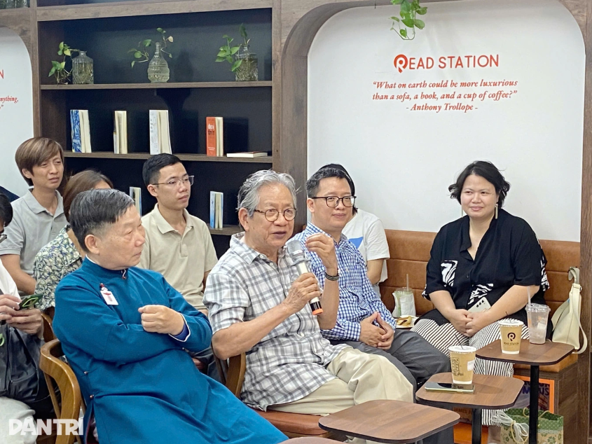 Nhà văn Lê Xuân Khoa (bên trái) tại buổi ra mắt tiểu thuyết “Từ trên giời rơi xuống” ngày 9/8 tại Hà Nội (Ảnh: Lê Phương Anh).